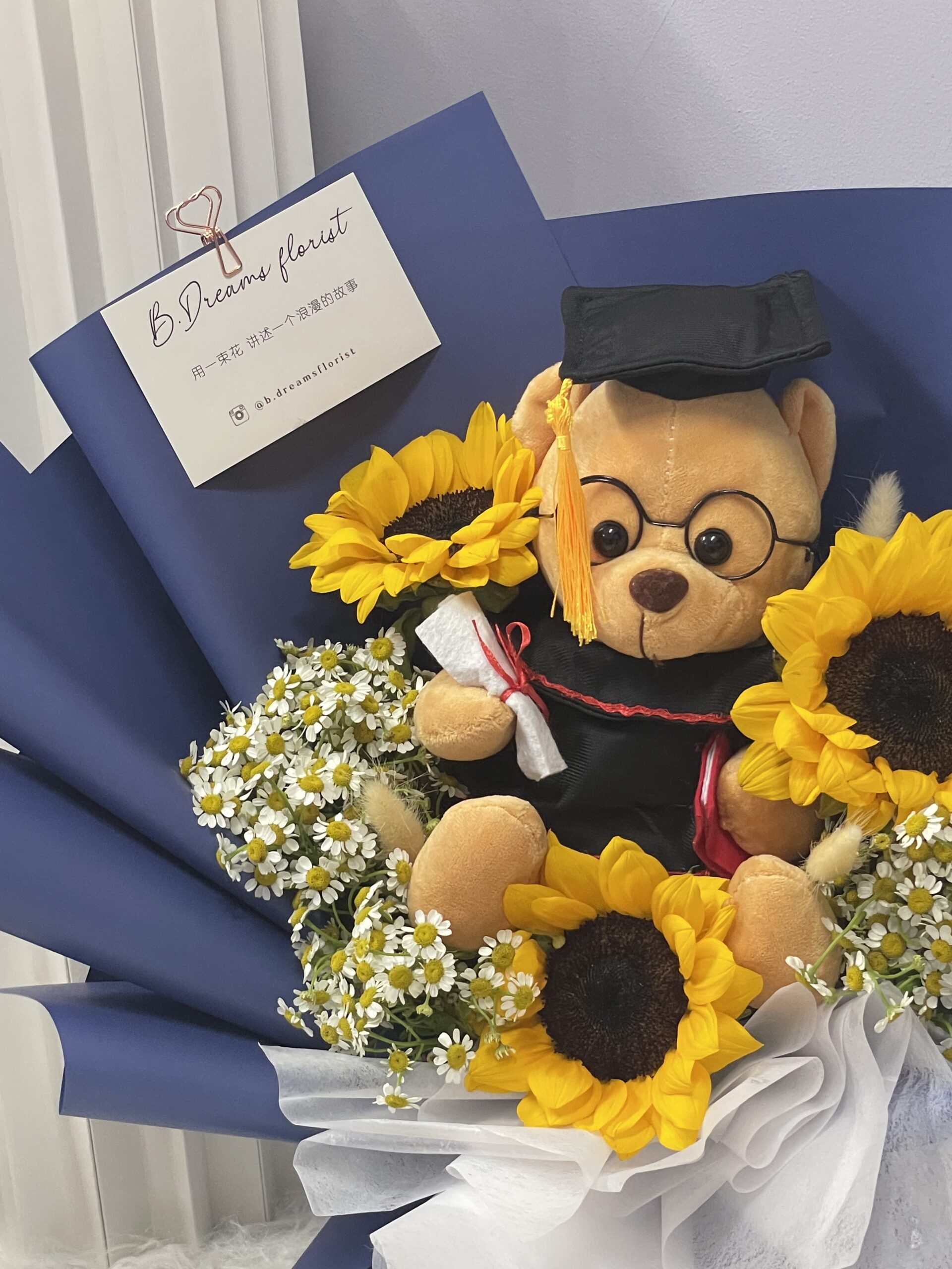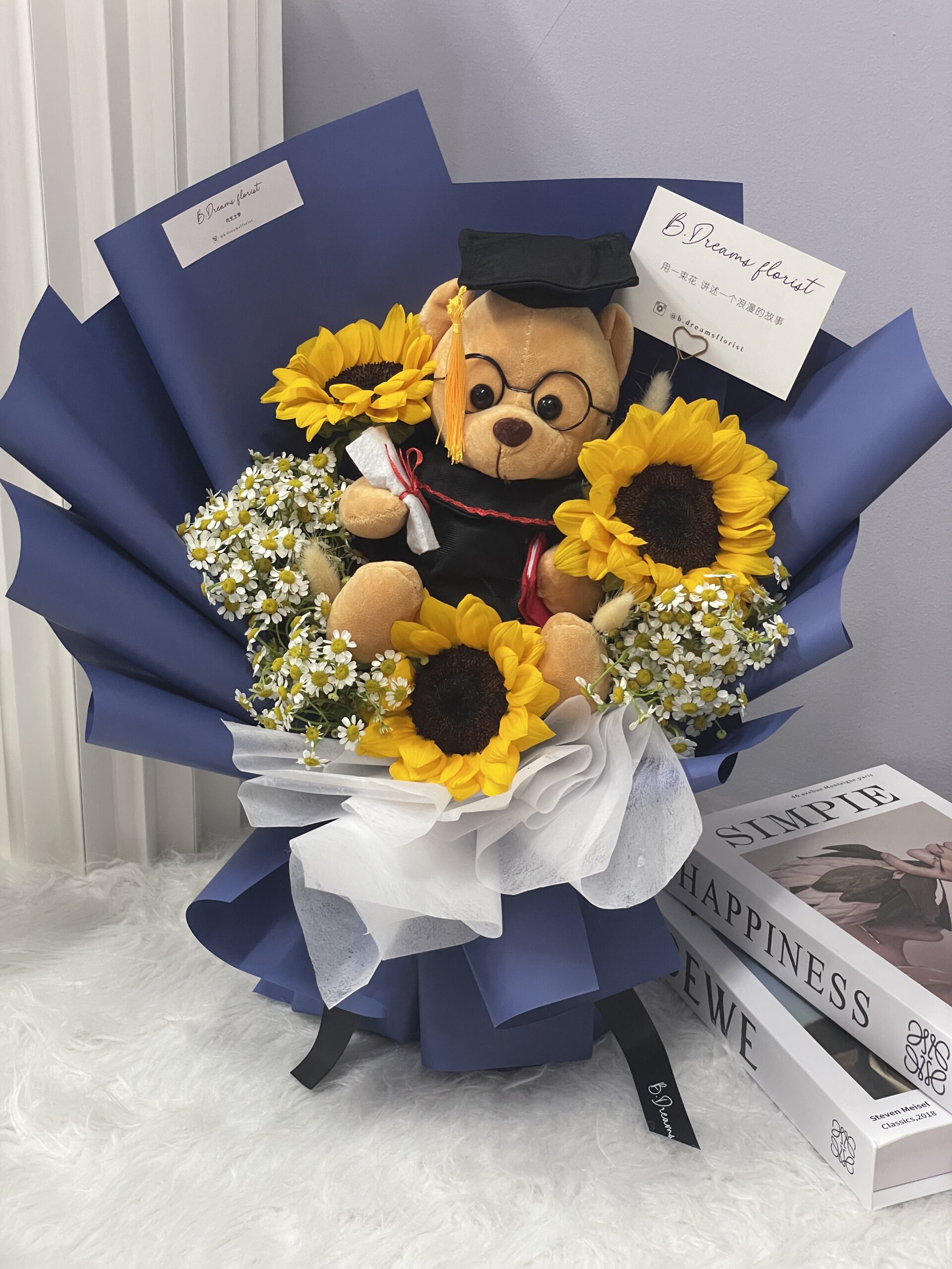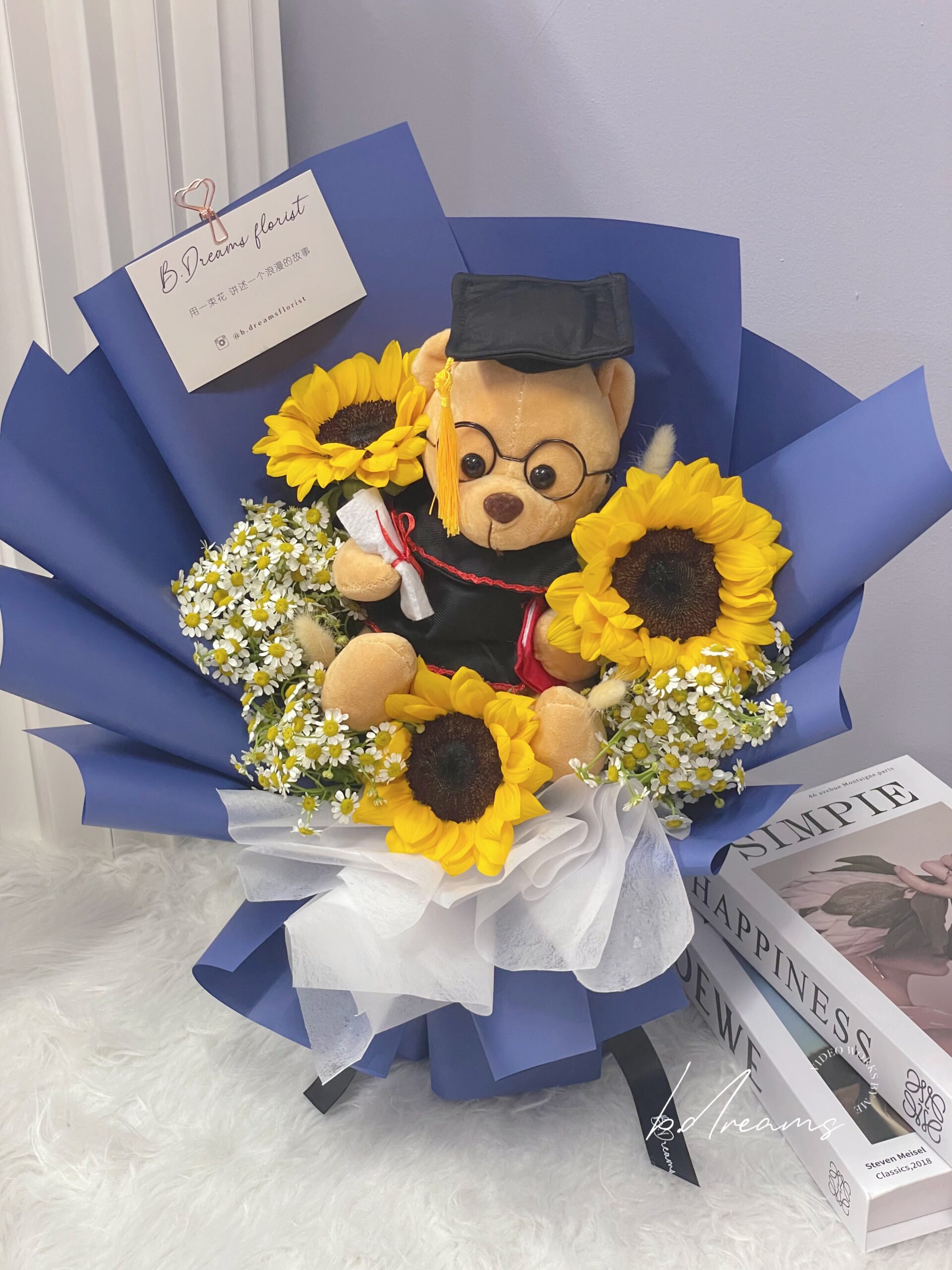 Featuring cheerful sunflowers and delicate daisies wrapped in elegant blue and white tones, this bouquet celebrates achievement and new beginnings — a bright and hopeful gift for every proud graduate.