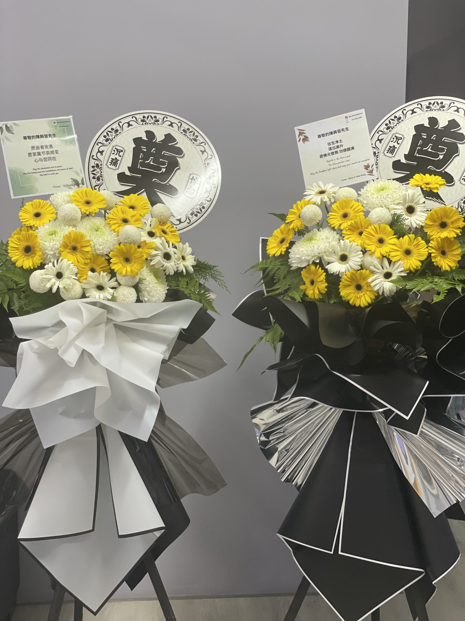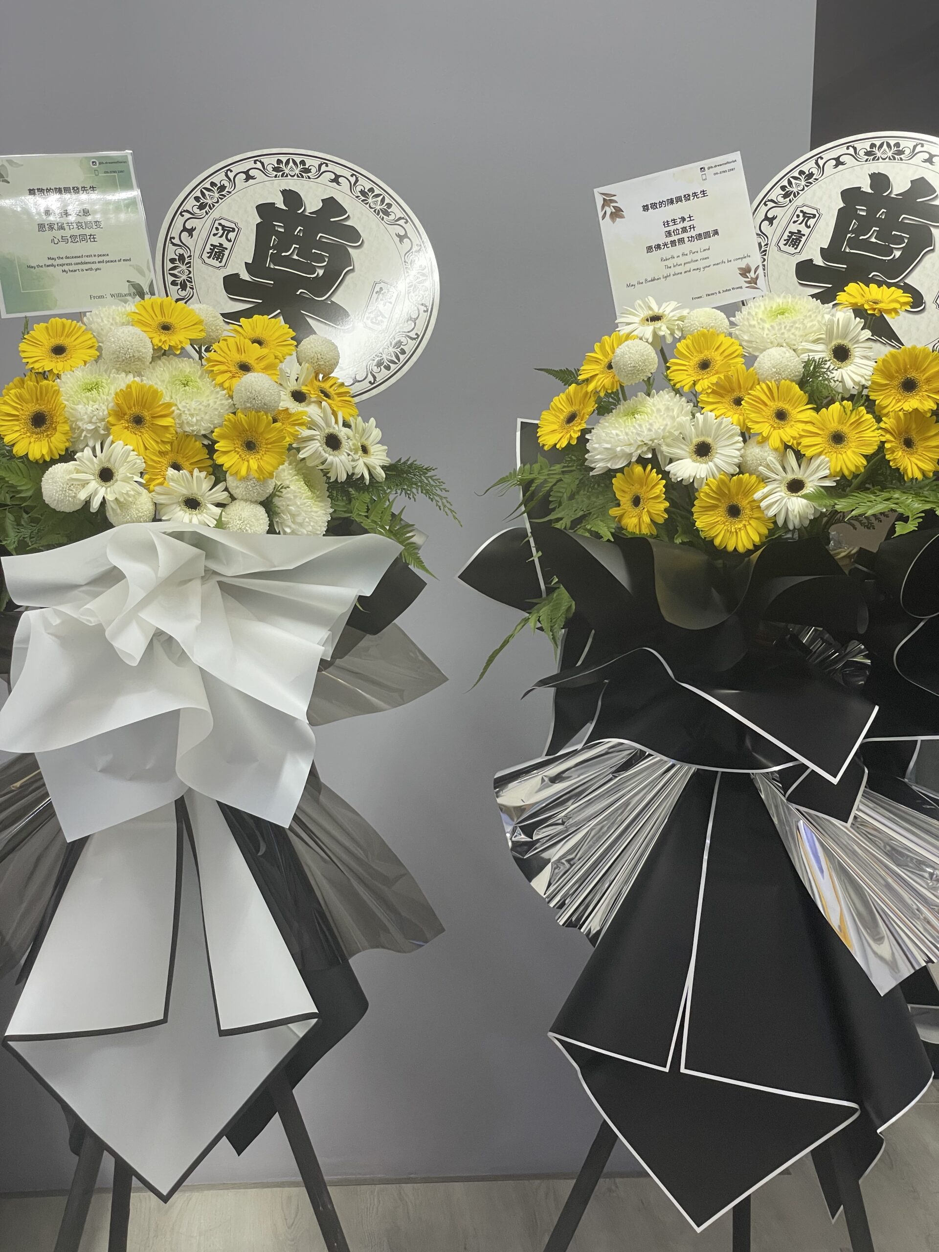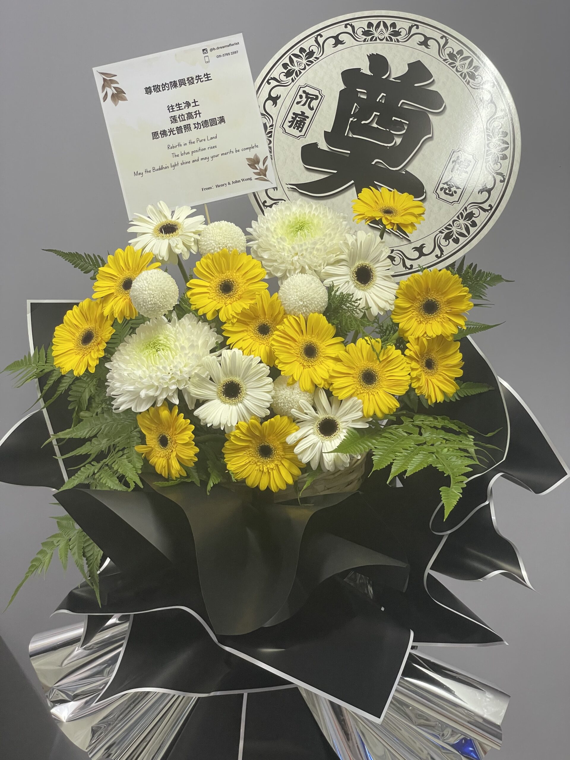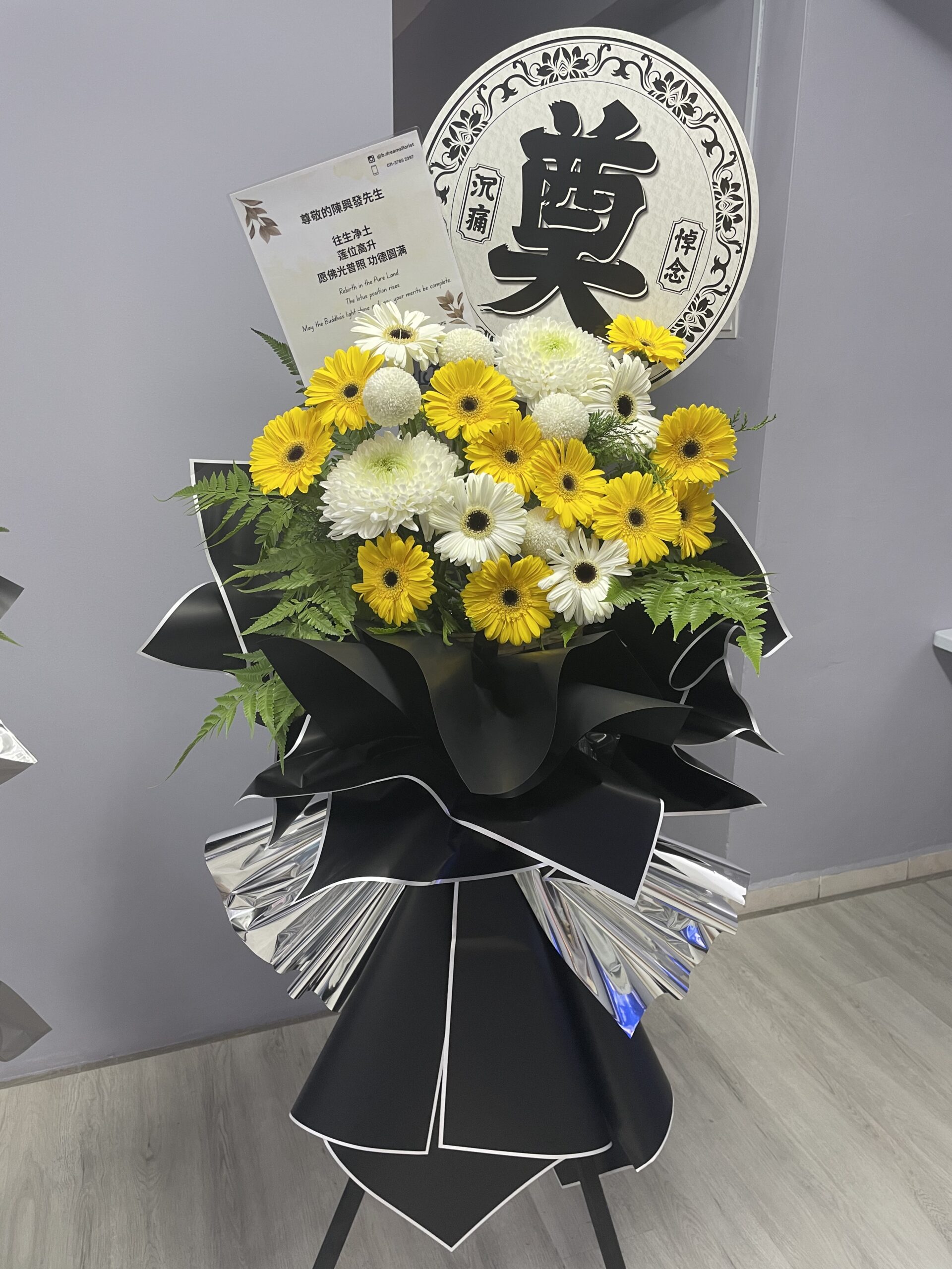 Featuring yellow and white chrysanthemums wrapped in elegant black and white tones, this arrangement expresses respect, remembrance, and peace — a heartfelt tribute for memorials or farewell ceremonies.