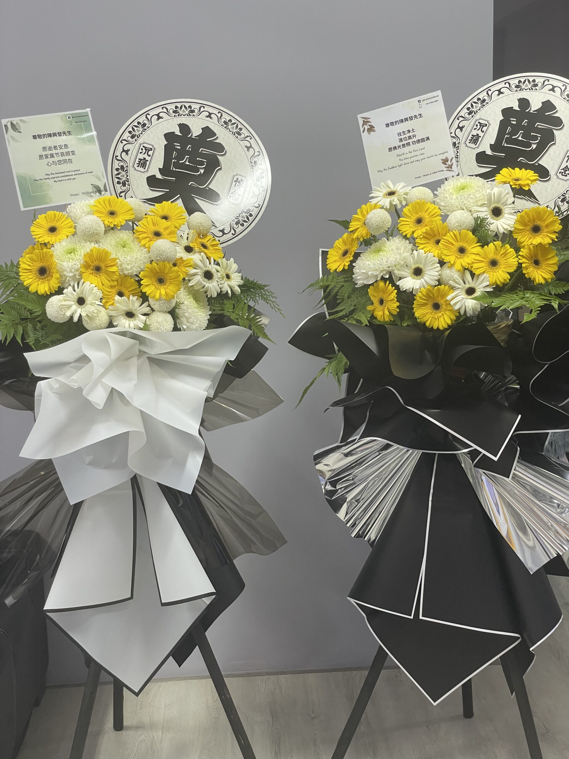 以黄白菊花为主,搭配庄重黑白包装,传达思念与敬意。花语象征平静安息与真挚怀念,适合作为追思、吊唁或告别仪式用花。