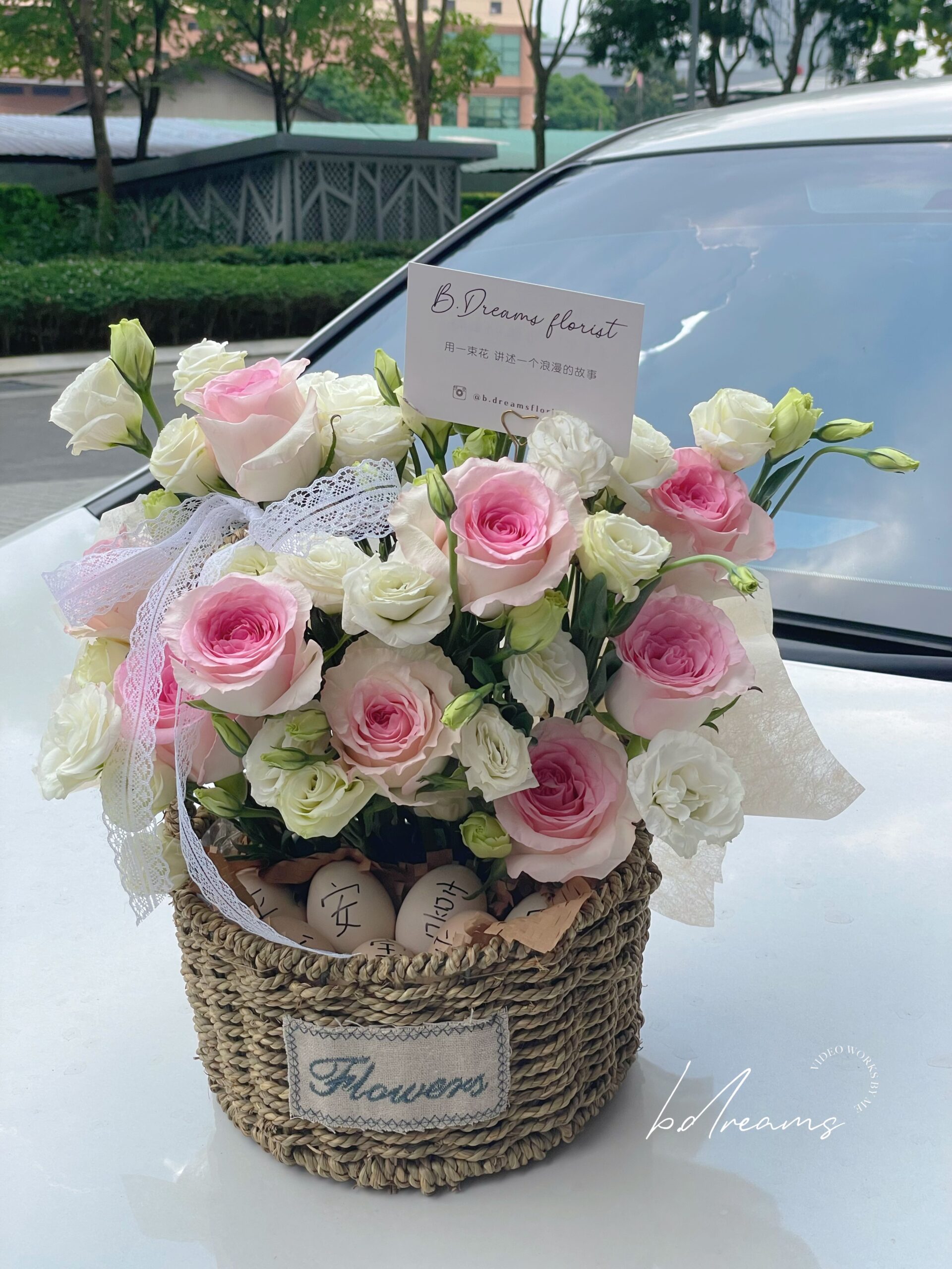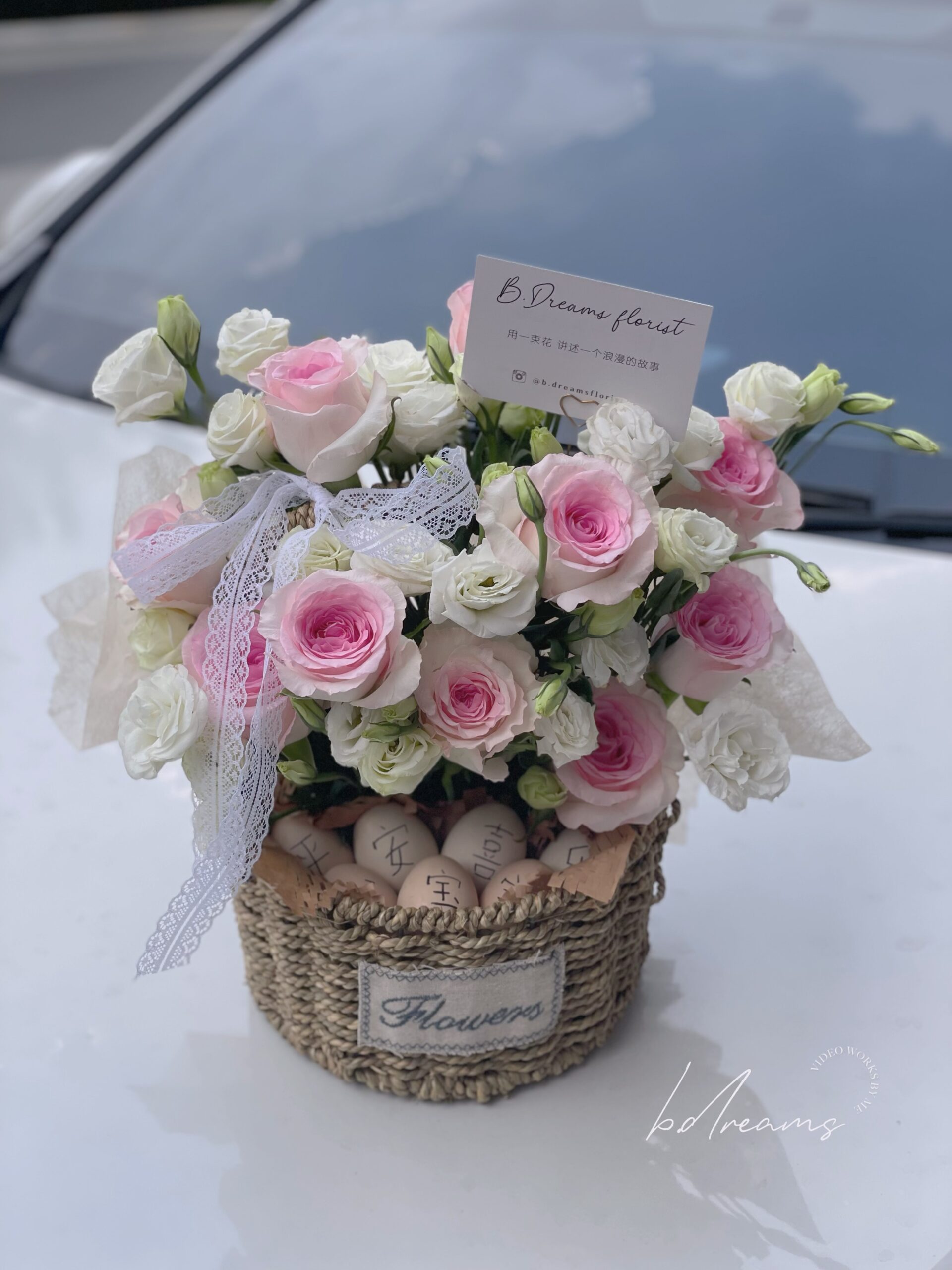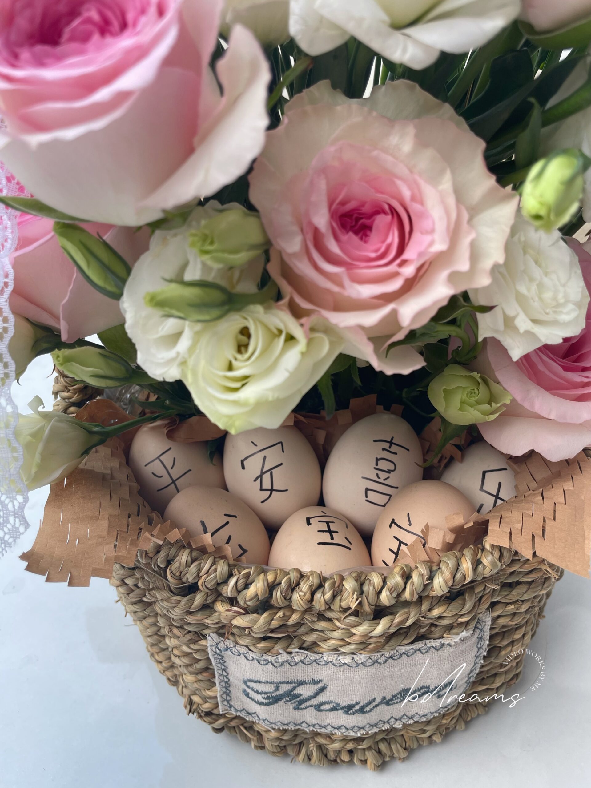 Featuring soft-toned blooms in a rounded arrangement, this flower basket symbolizes happiness, completeness, and heartfelt blessings — perfect for full moon celebrations, newborn gifts, or joyful occasions.