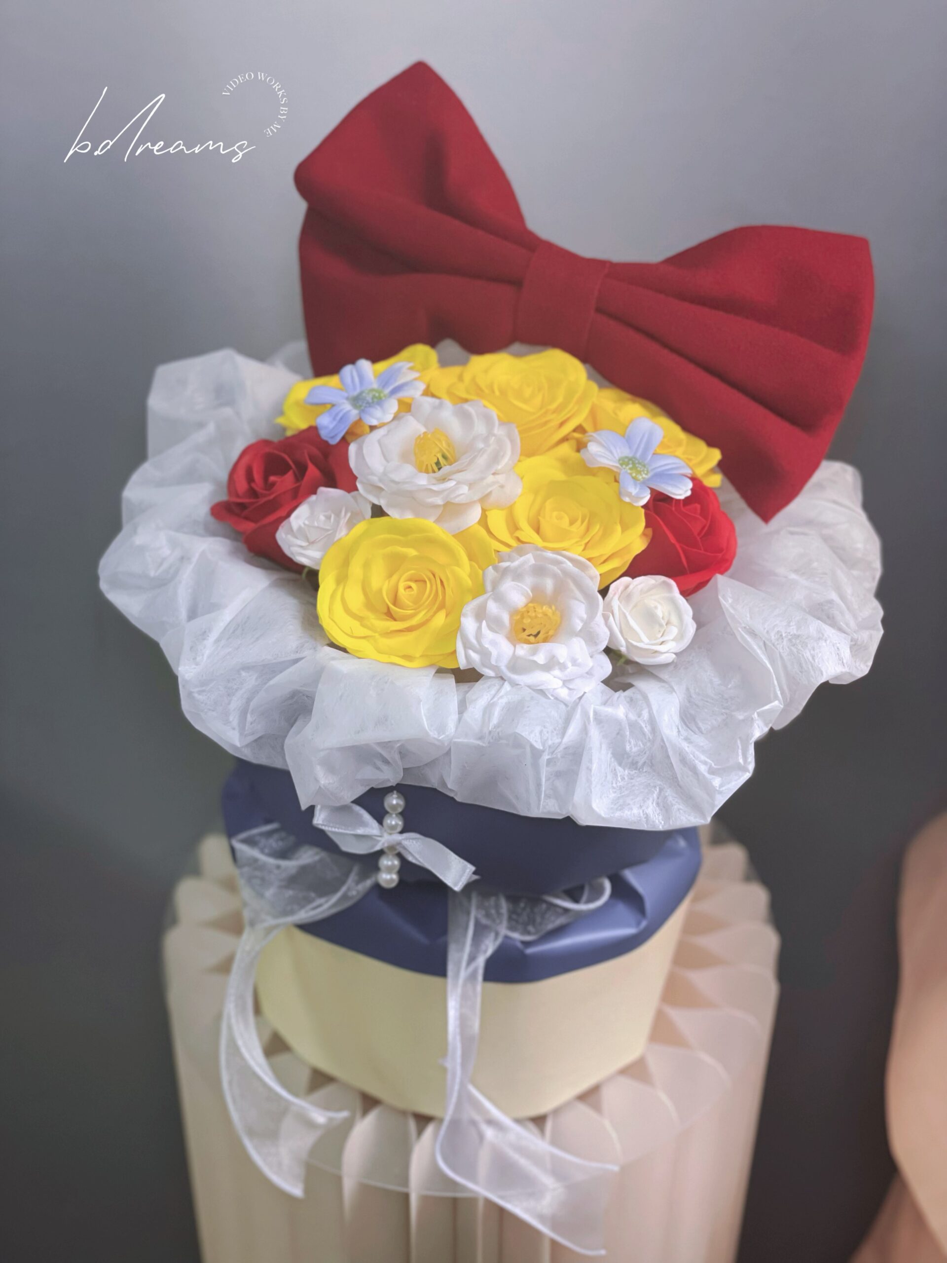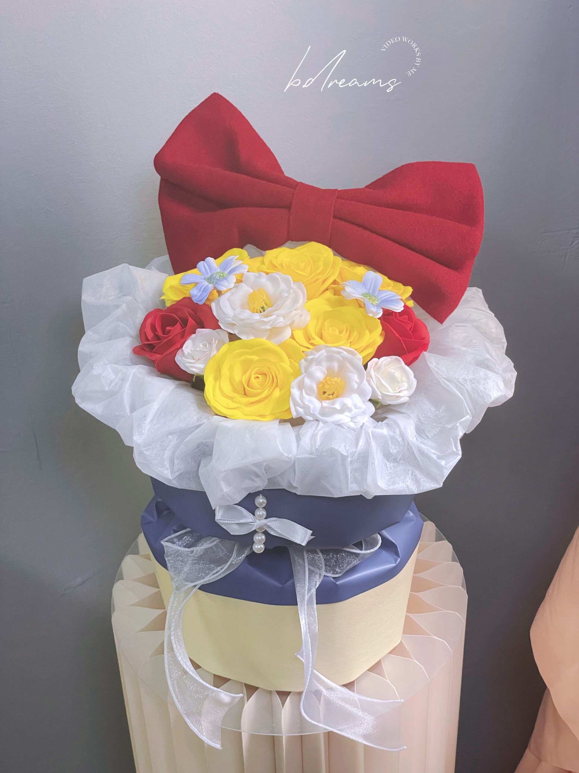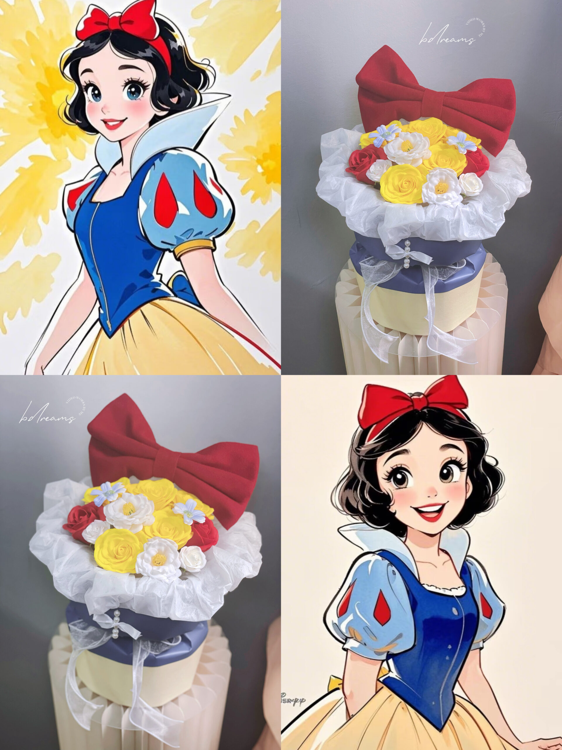 以蓝色花篮搭配黄白花朵与红色蝴蝶结,灵感源自白雪公主的经典配色。色彩明亮、造型梦幻,象征纯真、美丽与幸福,是送礼或装饰的童话系花艺之选。