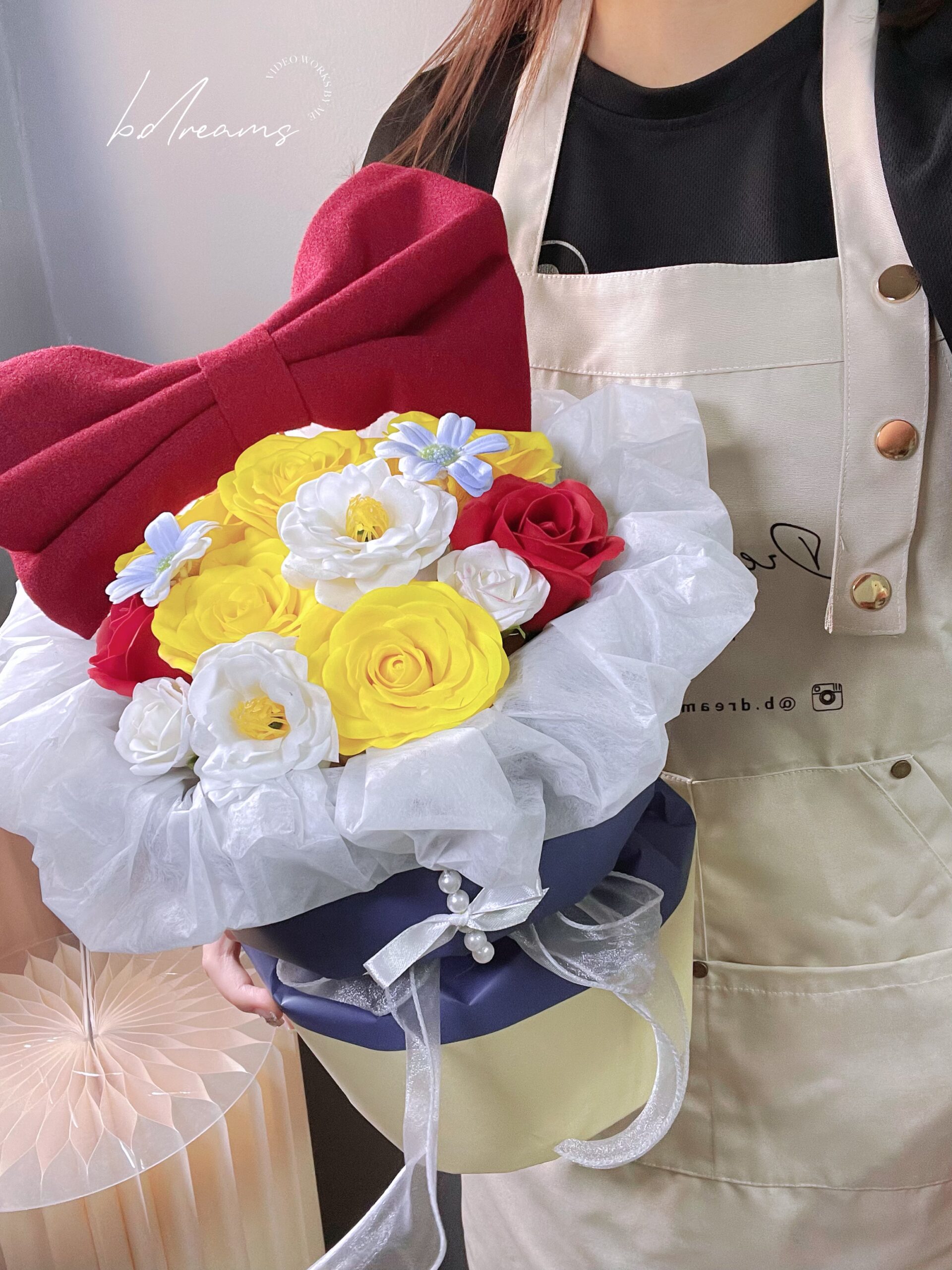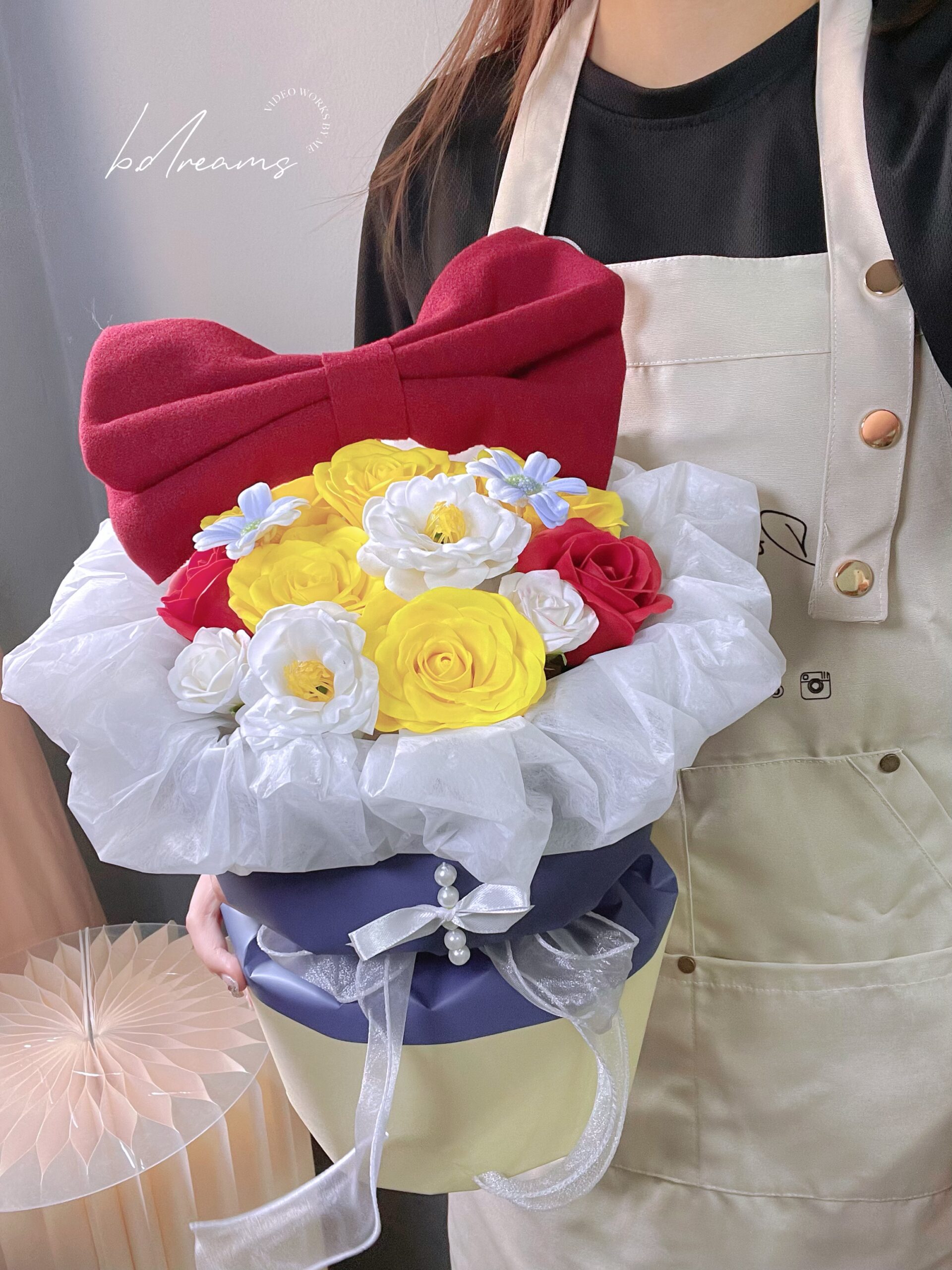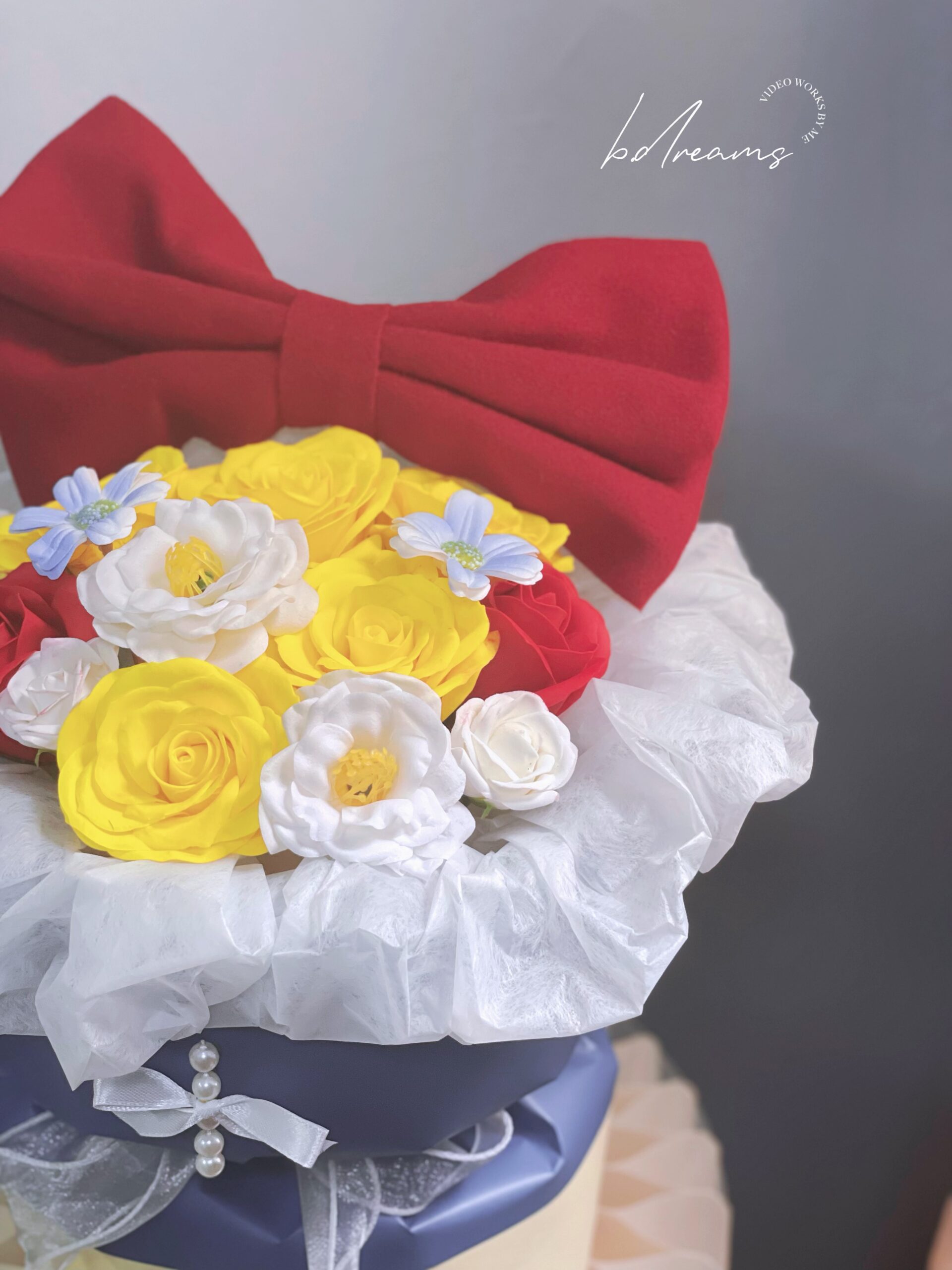 以蓝色花篮搭配黄白花朵与红色蝴蝶结,灵感源自白雪公主的经典配色。色彩明亮、造型梦幻,象征纯真、美丽与幸福,是送礼或装饰的童话系花艺之选。
