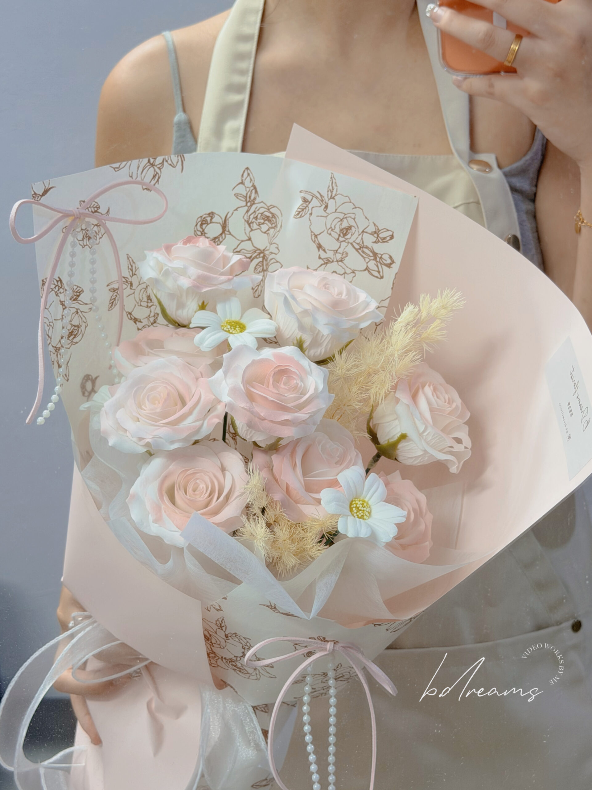 以粉嫩系香皂花打造,如泡泡般轻盈浪漫。整体色调甜美清新,象征温柔、怦然心动与纯真爱意。适合生日、纪念日或送给喜欢甜美风格的她。