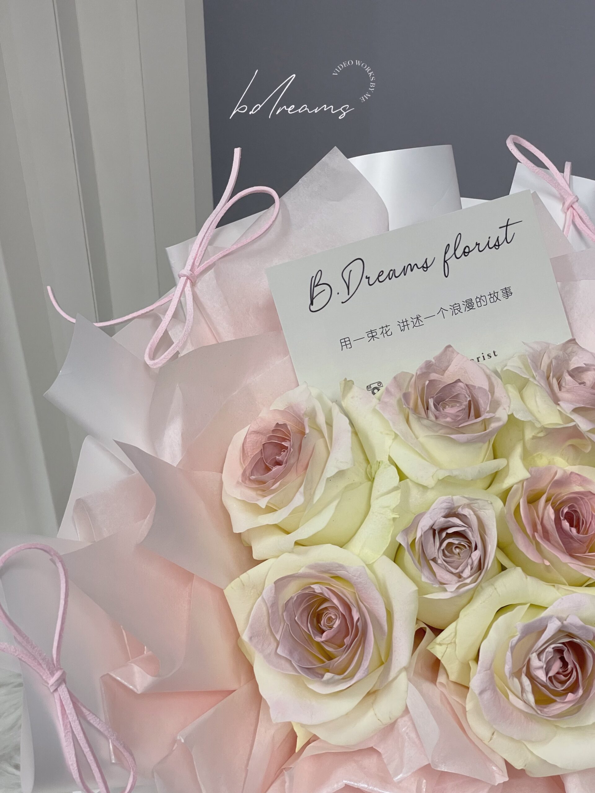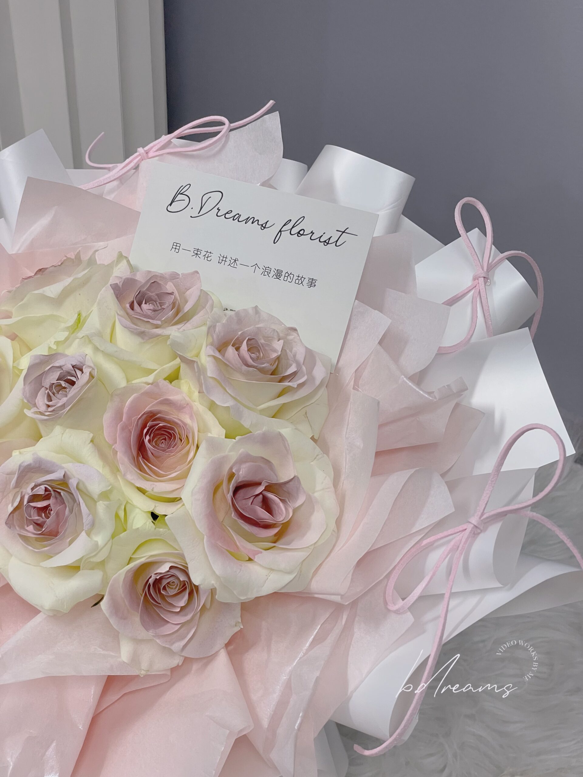 以粉白色系花材打造,如芭蕾舞般轻盈浪漫,散发优雅与纯洁气息。适合送给恋人、朋友或作为生日与庆祝礼物。