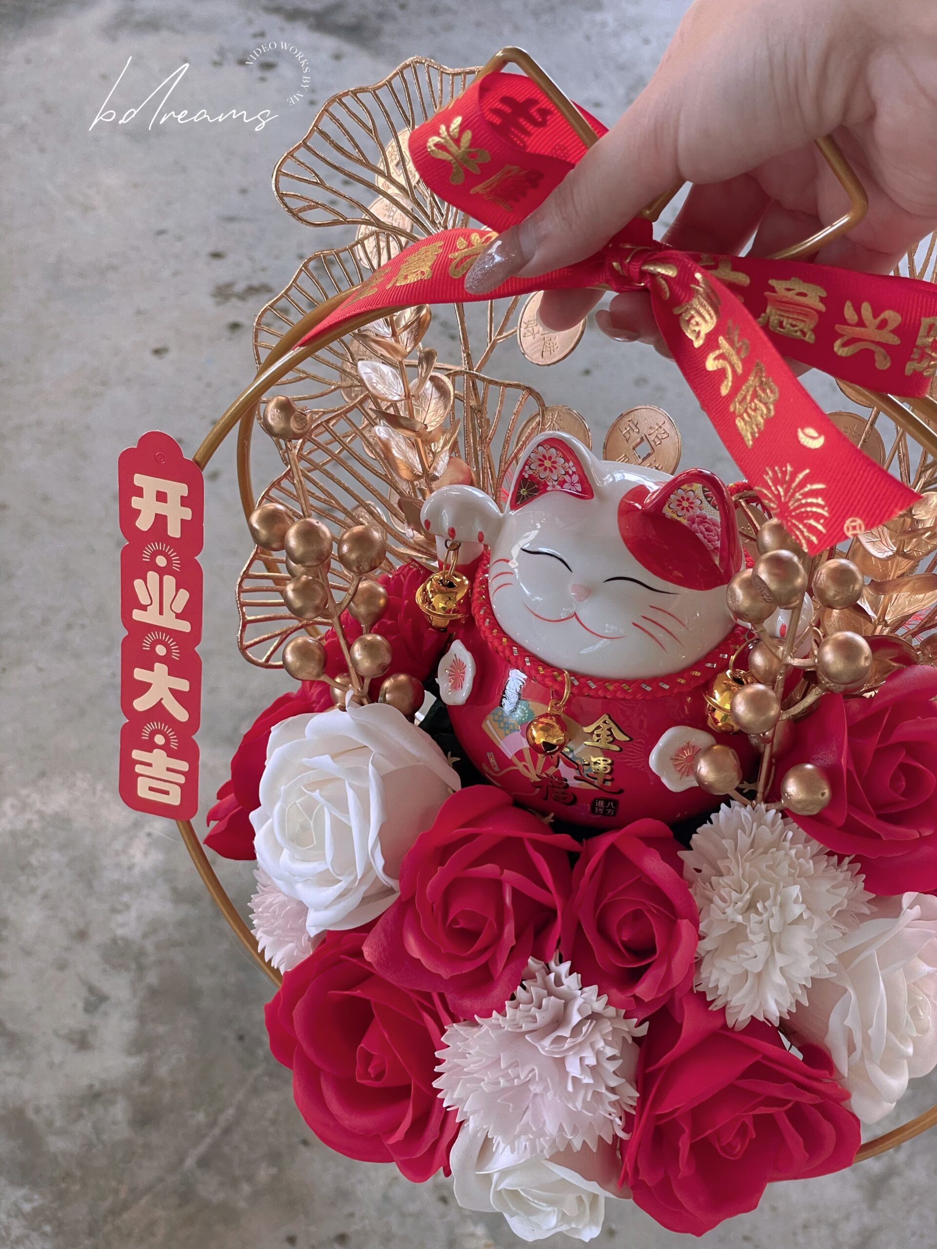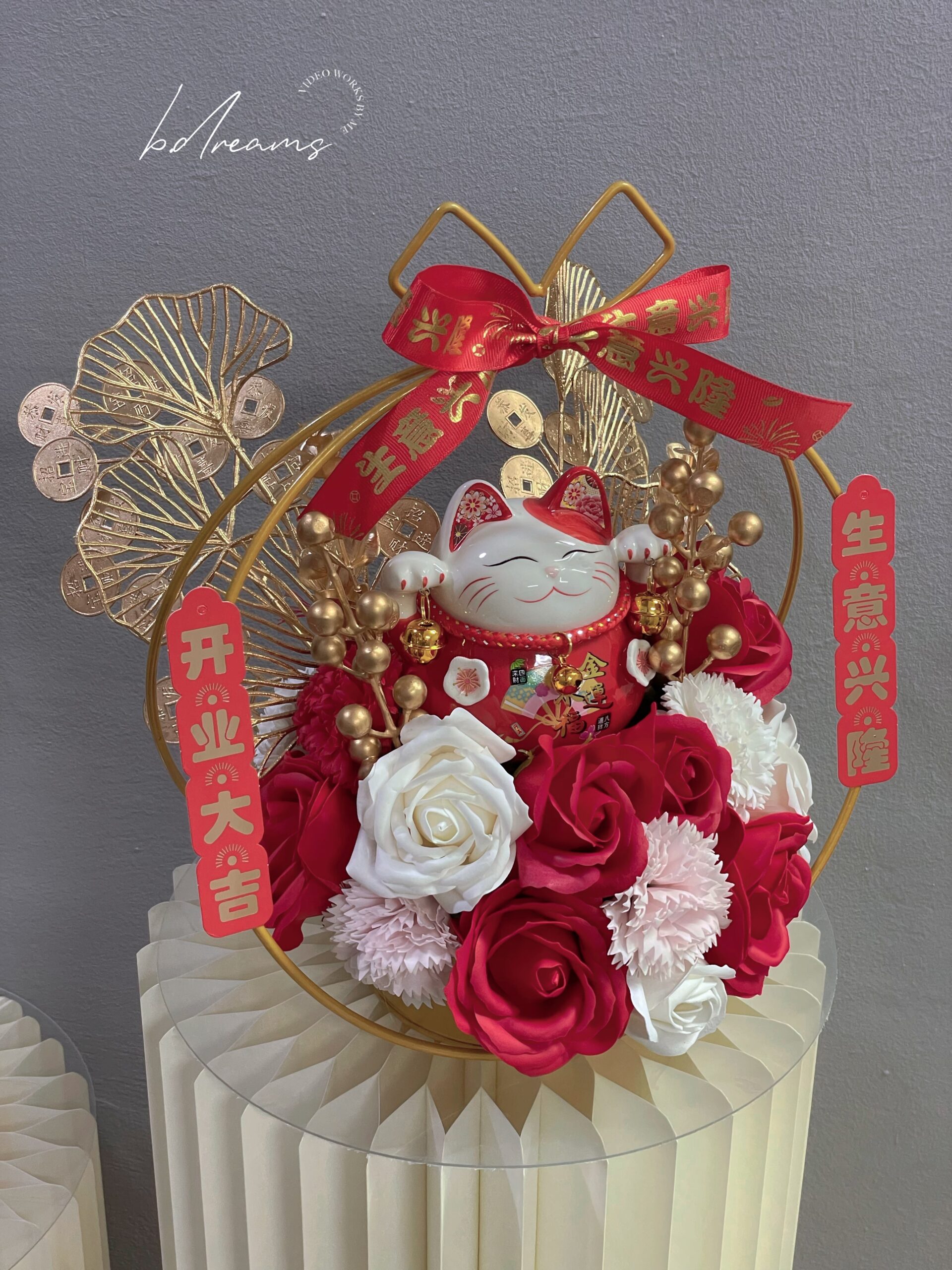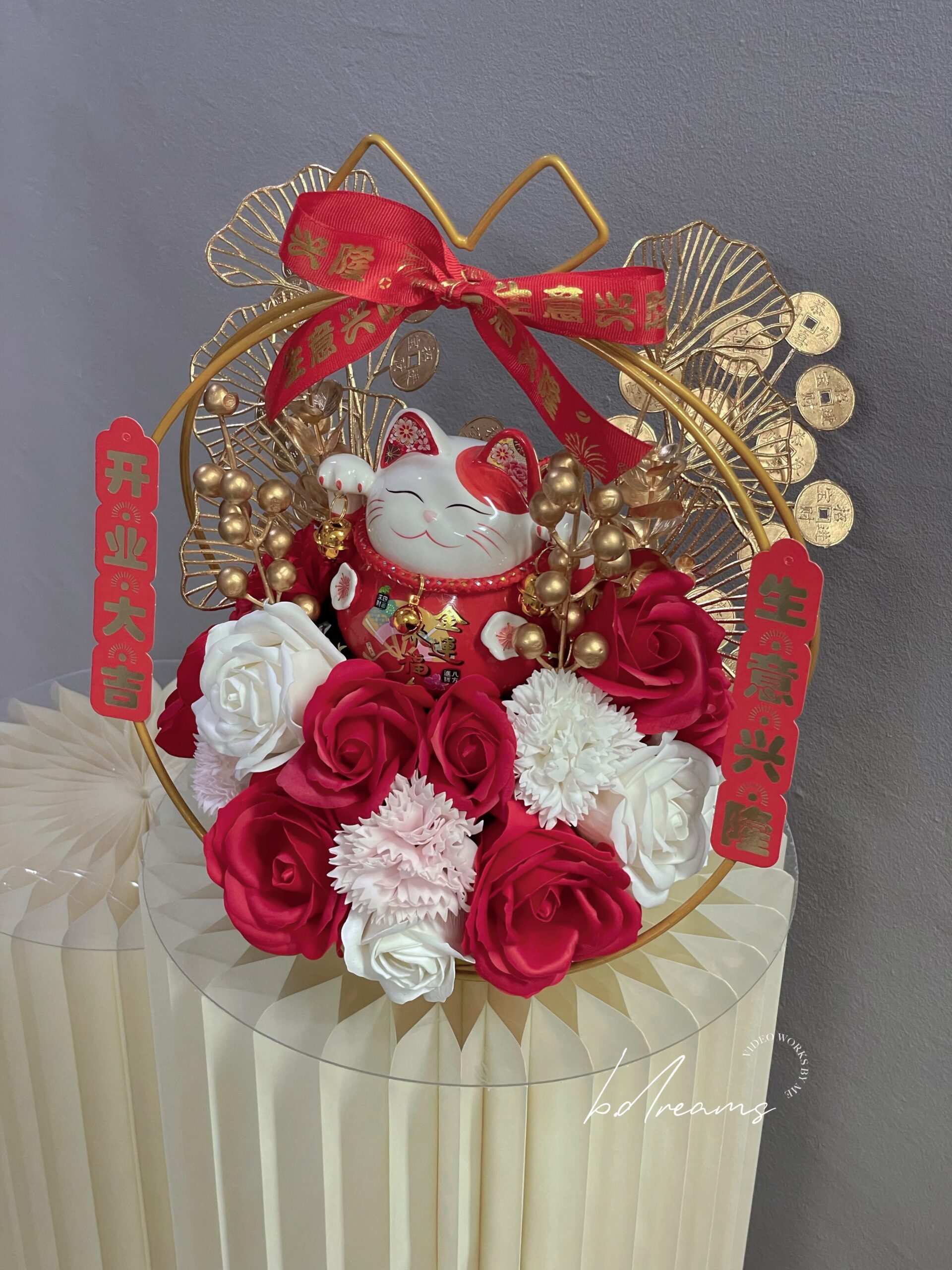 Featuring vibrant red blooms framed in elegant gold, this arrangement symbolizes celebration, passion, and prosperity. The luxurious design adds a touch of class — perfect for grand openings, festive events, or romantic gifting.